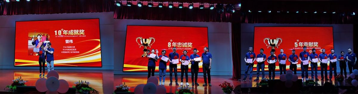伴随着歌舞、小品、游戏各个环节的欢庆,迎来了庆典的高潮部分--颁奖环节。分别对5年贡献,8年忠诚,10年成就的老员工进行了颁奖仪式。