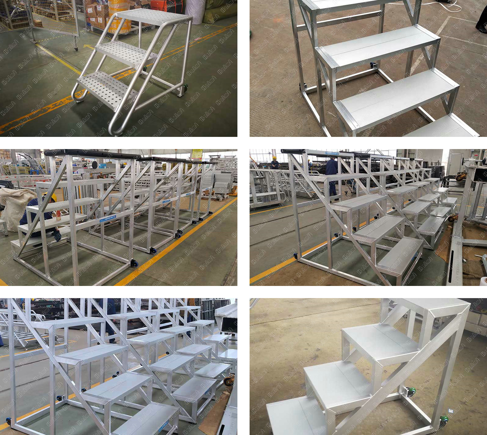 铝合金踏步梯,支腿侧配备两滚轮,使用转场快捷轻便。