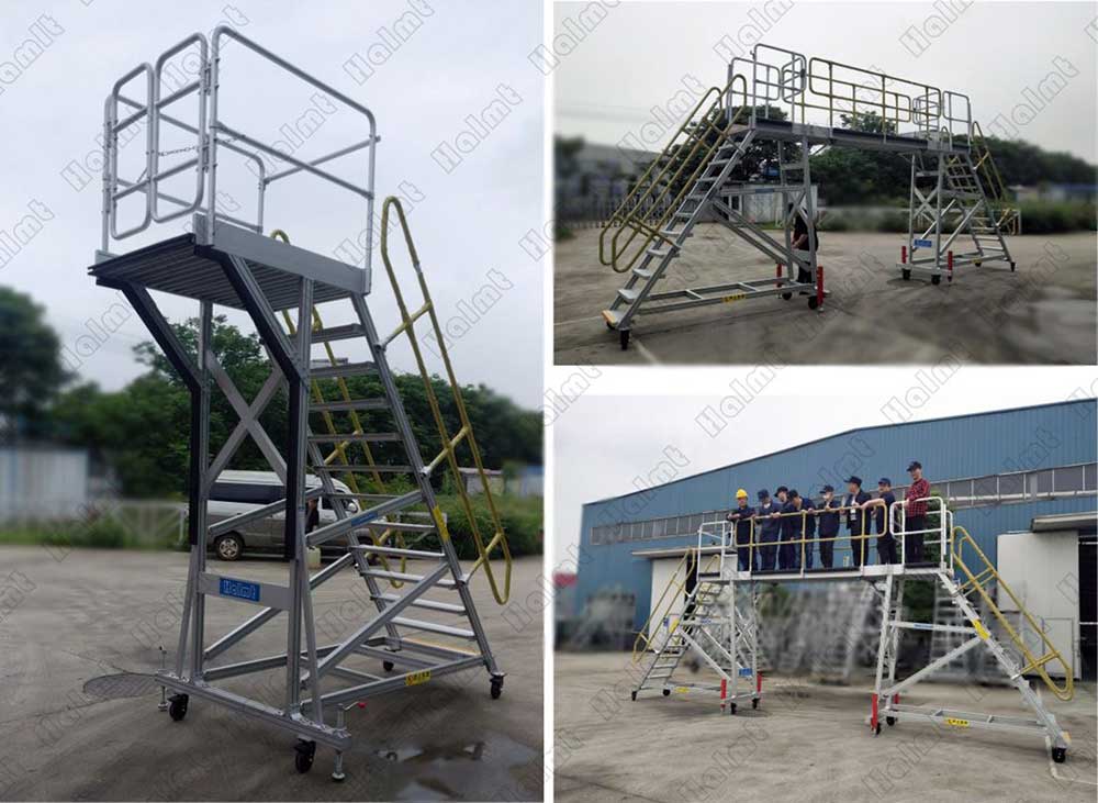 华铝机械为某航天装备制造单位量身设计制作了一批铝合金工作梯,包括:1-4级踏凳、2.5米和3米工作梯及组合平台。产品全部采用阳极氧化铝合金材质,更安全,更便利,更轻巧,更美观。