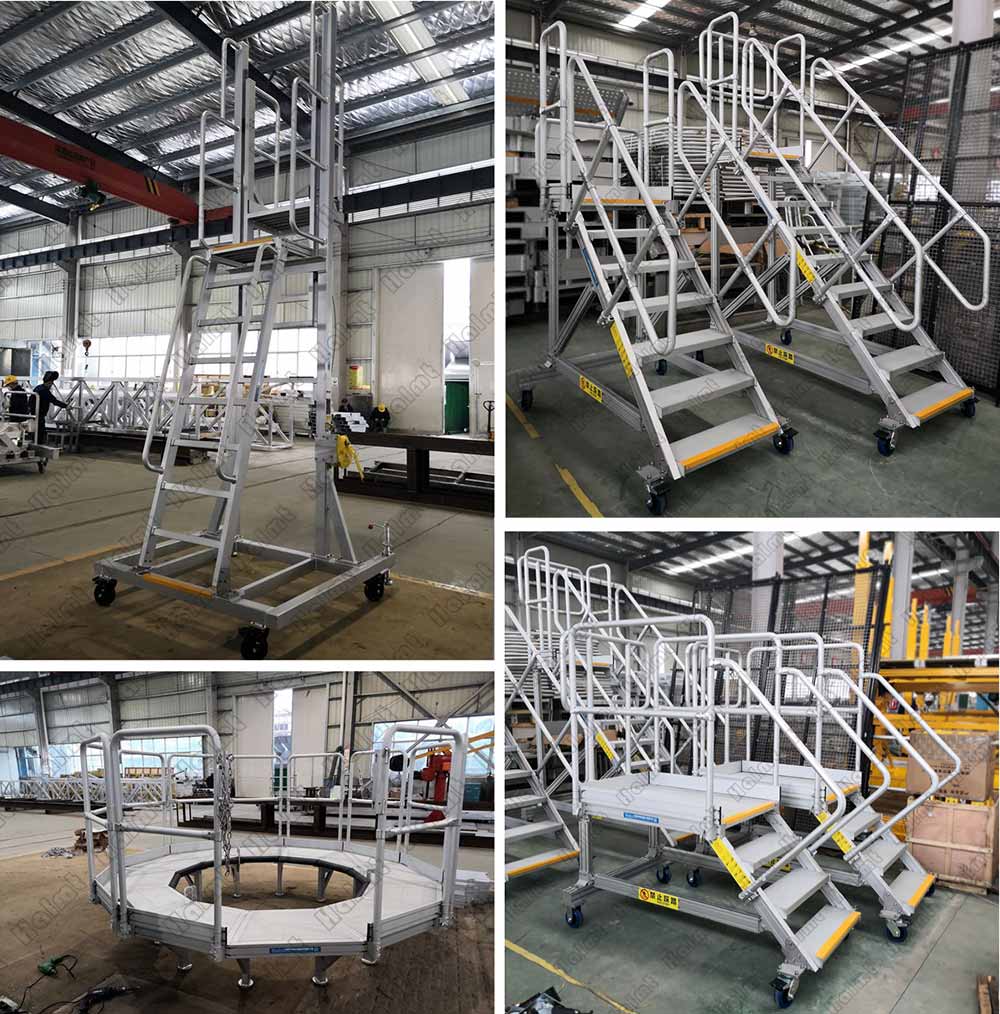 产品包括:多规格通用移动平台梯、磁覆组上下转子移动升降工作梯及前轴防护踏步圆形走台。
