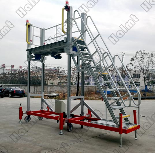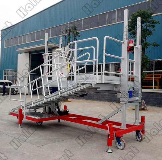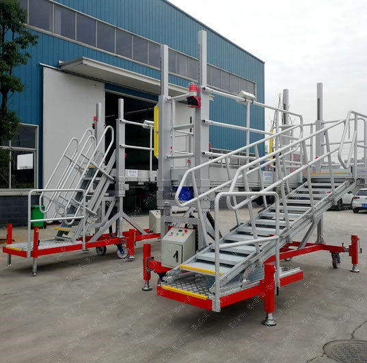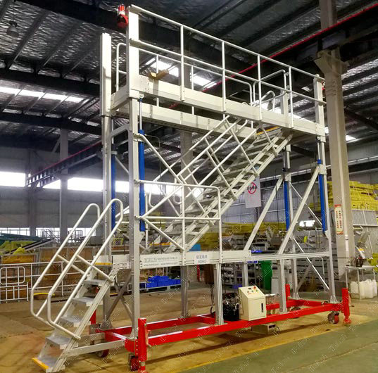 防滑铝合金齿条踏步和平台踏板,全包围护栏设计,首末台阶警示条设计,与设备或建筑接触处采用防撞橡胶条设计,更大程度保证人员和设备的安全。铝合金结构,轻巧美观,免维护,两人即能完成转场和移动。