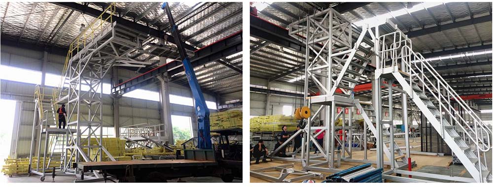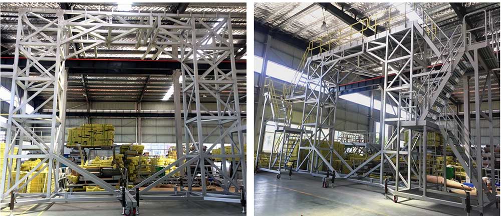 罩体检修平台主体全部采用铝合金型材结构,在飞机不移动的情况下,只需2-3人可灵活、快捷的撤离场地;