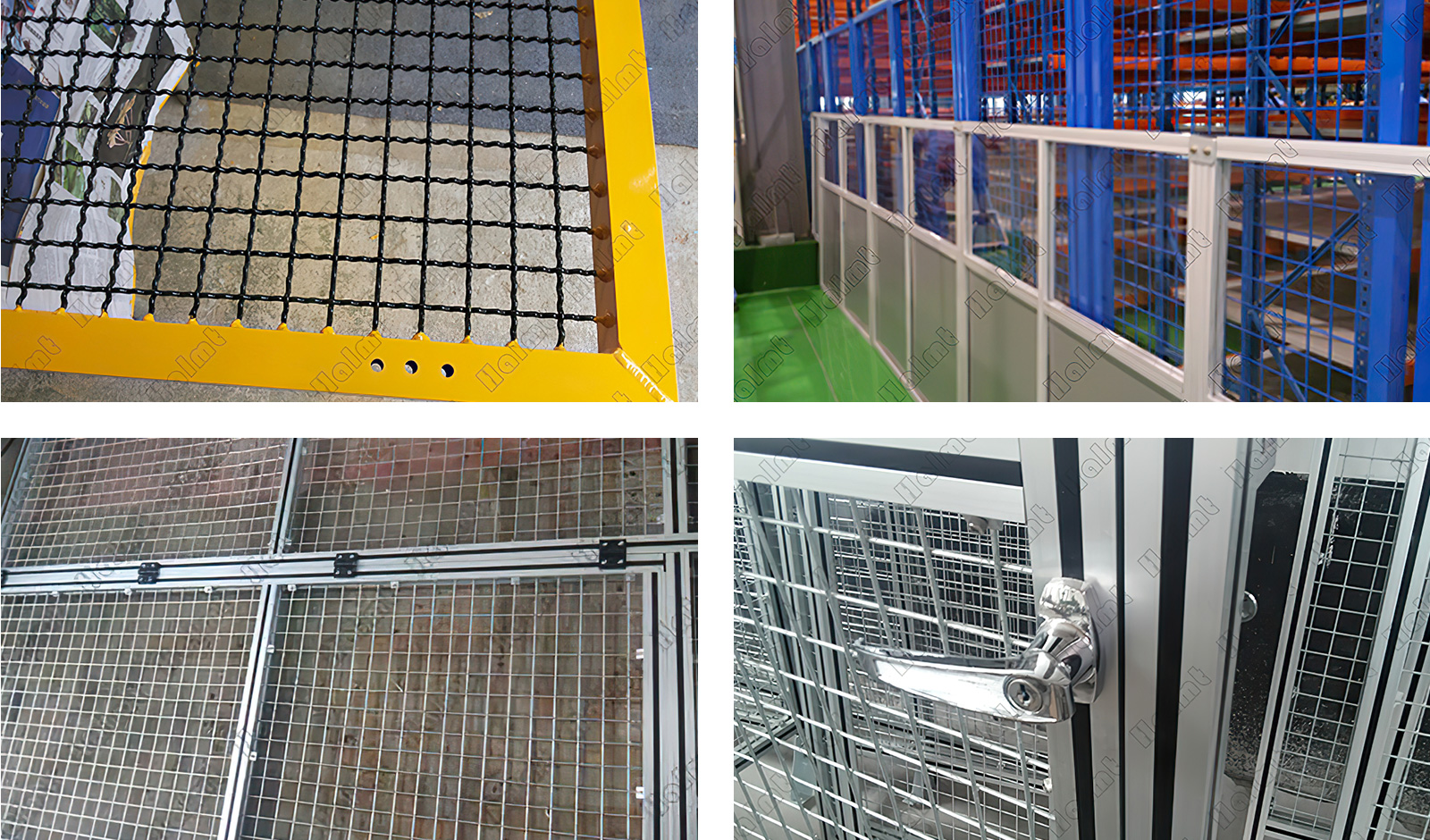 工业防护围栏,也称工业护栏,工业护网,工业围栏等。华铝机械采用铝合金工业型材作为框架的组合式防护围栏适用于各工业厂房或车间需要安全防护、消音隔声、粉尘隔离的场合。
